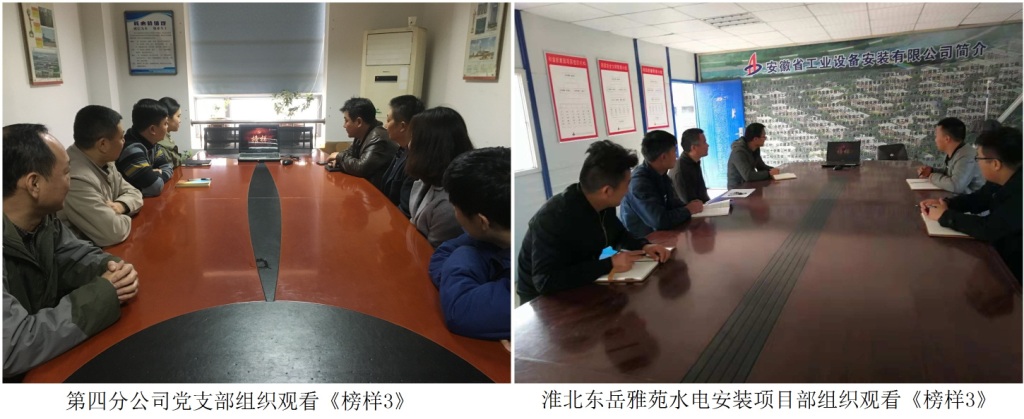 为深入学习贯彻习近平新时代中国特色社会主义思想和党的十九大精神,深入推进“两学一做”学习教育常态化制度化,树立优秀共产党员楷模,发挥先进典型示范作用,按照《中共安徽省委组织部关于认真做好<榜样3>专题节目学习宣传工作的通知》要求,近日,安徽安装公司组织各党支部、项目部党员干部职工集中观看《榜样3》专题节目。