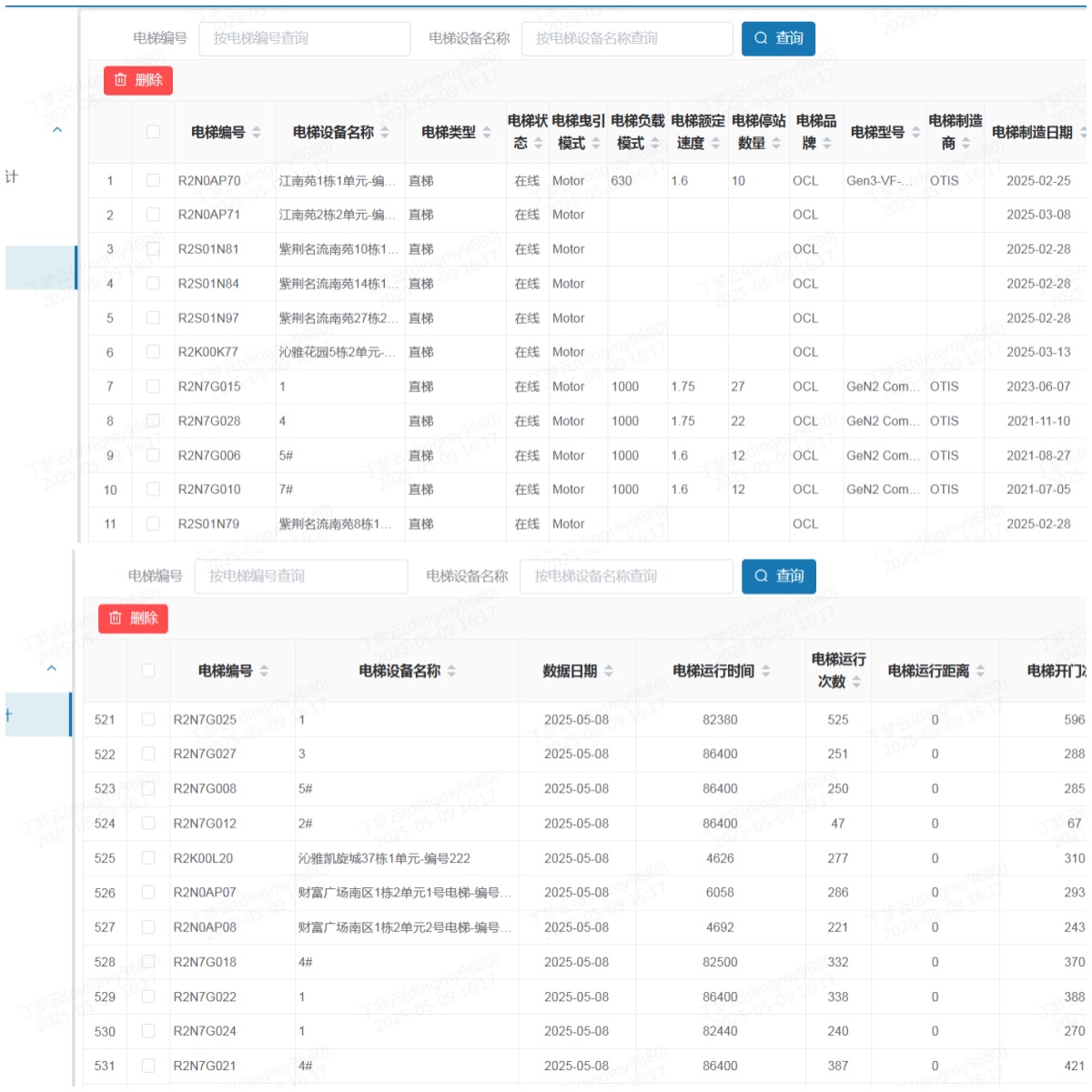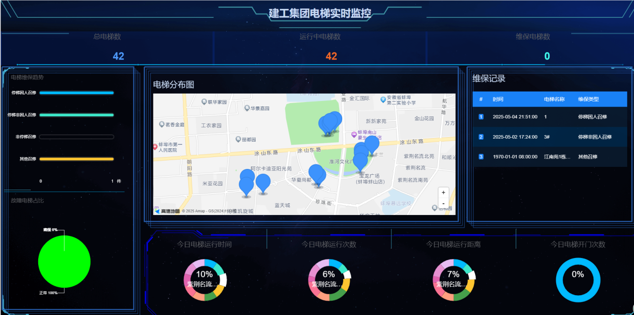 新搭建的电梯管理模块构建起高效的数据互通桥梁,不仅能够实时获取已上线电梯编号、电梯设备名称等各项基础数据,还能精准监测电梯运行时间、运行距离、运行次数、开门次数等动态数据信息。该系统可全程追踪电梯召修记录,详细记录召修维保上报时间、电梯维保人员到场时间,以及电梯故障处理过程、因故障困人后的解救时间等信息。这些数据的全面整合与实时呈现,能够全方位、立体化掌握每台电梯的运行状态及故障率,增强了电梯运行的安全性和可靠性,有效提升电梯维保效率。