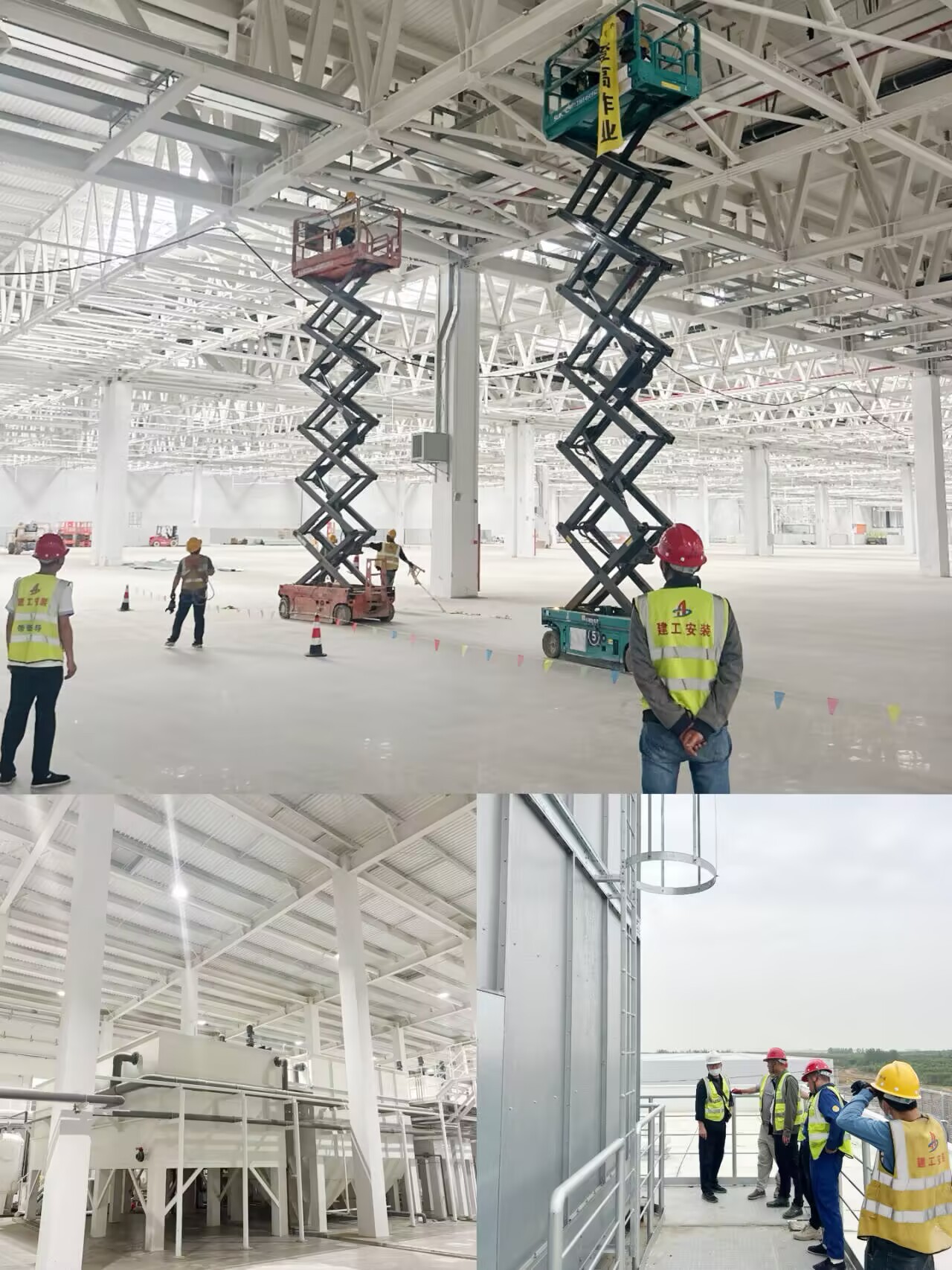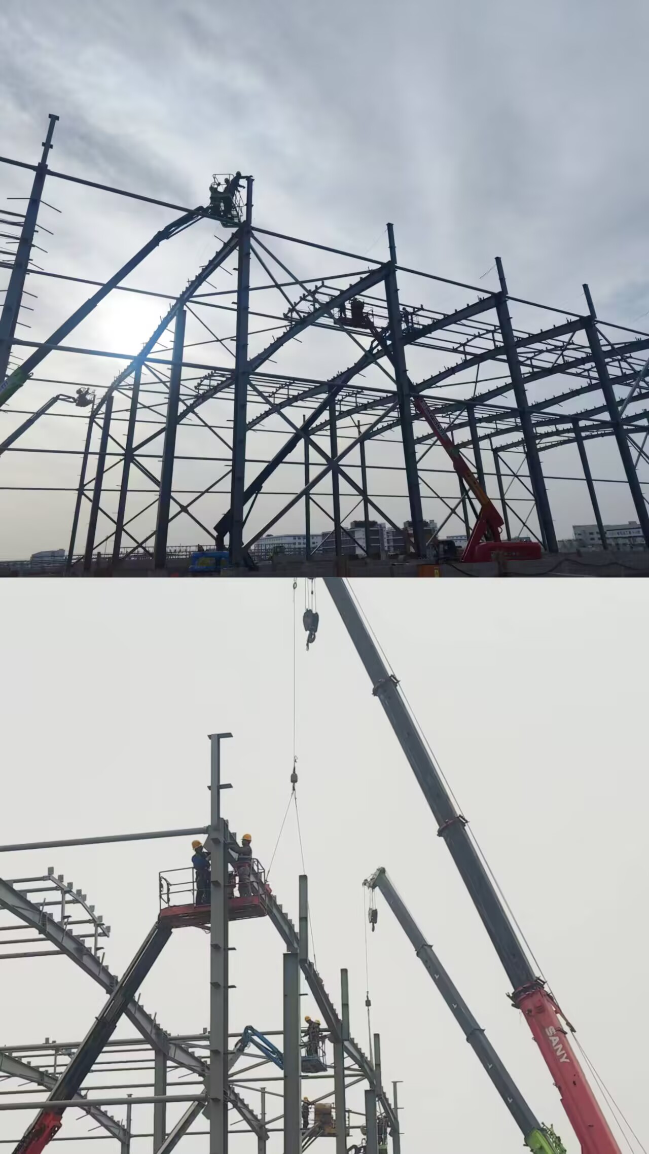 走进项目施工现场,起重机挥动着粗壮的钢铁臂膀划破天际,将一段段钢梁精准的吊装至安装位,曲臂车托举着工人将钢构件嵌入到预定位置,保障高空作业人员的生命安全。这是力量与技术的二重奏,更是安全与效率的完美平衡,一幅现代工业建筑的壮美画卷正徐徐展开。