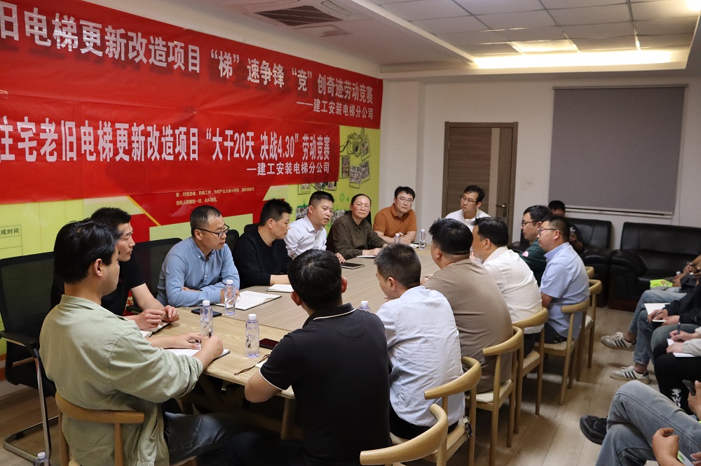 为推动劳动竞赛工作的有力开展,进一步激发广大参建员工立足岗位建新功的劳动激情,推动项目提质增效,顺利完成项目目标任务,4月10日下午,建工安装电梯分公司蚌埠2024年住宅老旧电梯更新改造项目开展了以“大干20天,决战4.30”为目标的劳动竞赛大讨论活动。电梯分公司领导班子成员、项目部管理人员、参建单位及劳务班组代表参加会议。