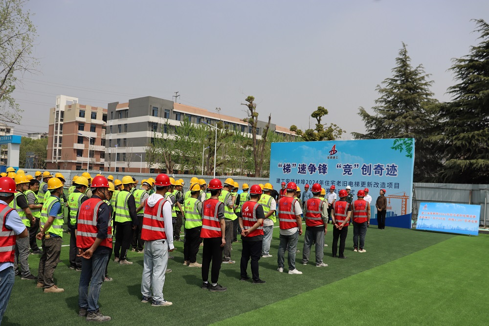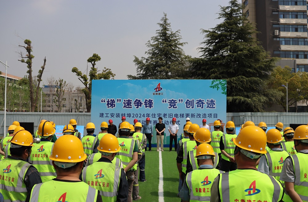为贯彻集团和公司两级职代会精神,落实公司劳动竞赛活动相关工作要求,加快工程建设进度,不断提高项目管理和建设水平,4月10日,建工安装电梯分公司蚌埠2024年住宅老旧电梯更新改造项目举行了以“梯”速争锋 “竞”创奇迹为主题的劳动竞赛启动仪式,正式吹响了“大干20天,决战4.30”劳动竞赛的奋进号角。蚌埠市城市投资控股有限公司代表、分公司班子成员、项目部管理人员、各参建单位代表及作业人员共130余人参加活动。