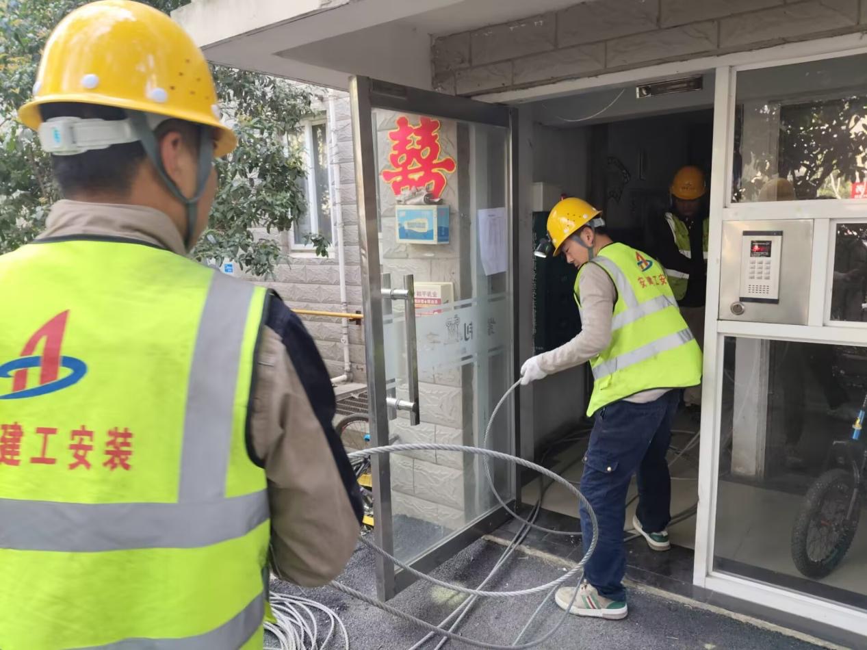 六安市金安区住宅老旧电梯更新项目施工人员正在安装电梯层门