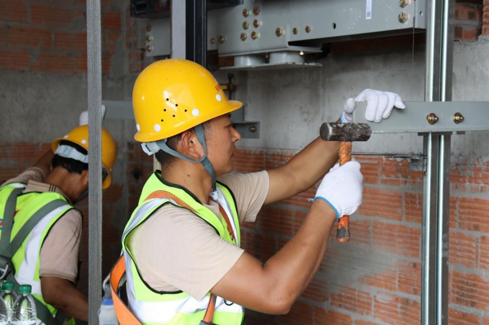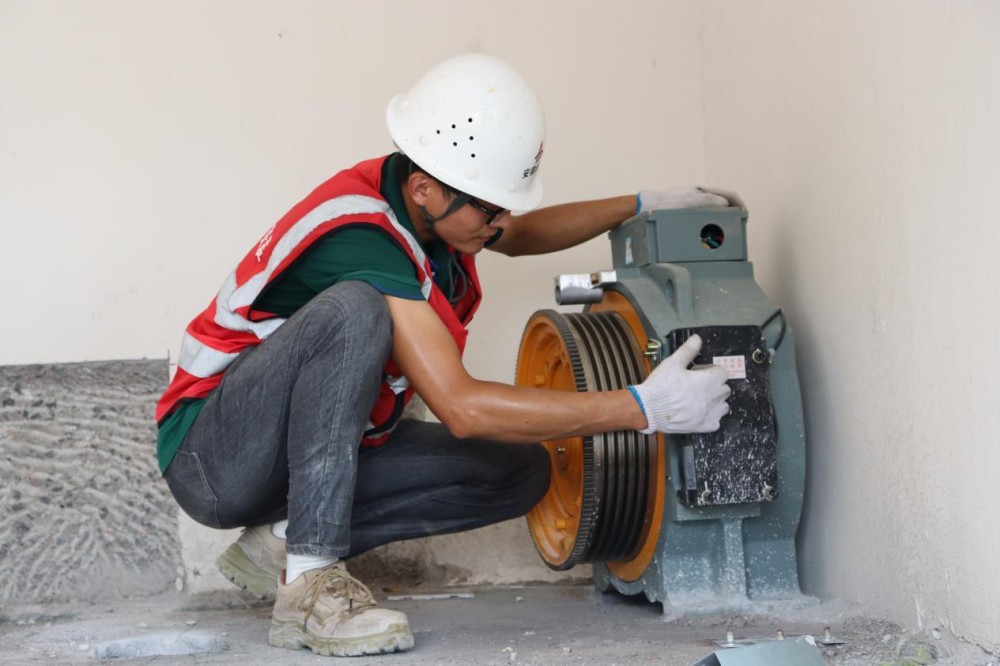 桃花科创产业园EPC项目施工人员正在调试电梯主机平衡度
