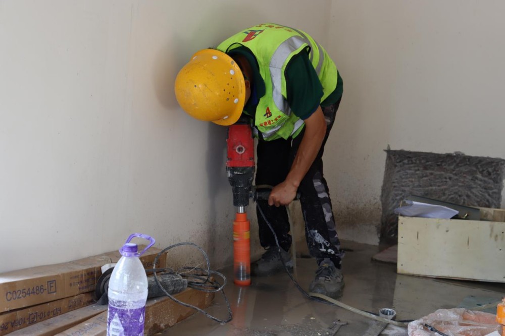 肥西县城乡一体化发展花岗项目施工人员正在对机房地面进行孔洞开凿